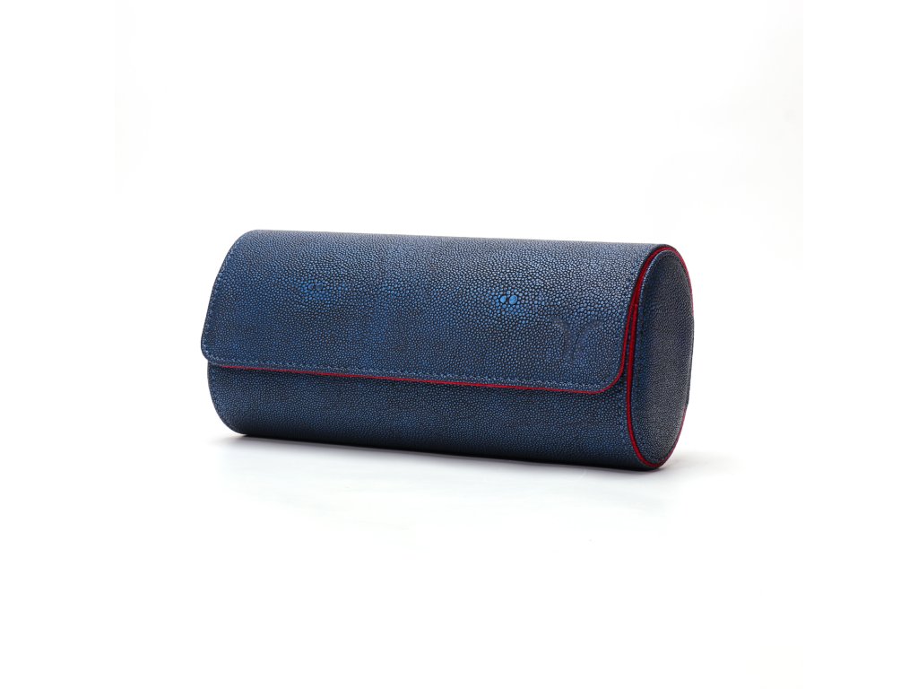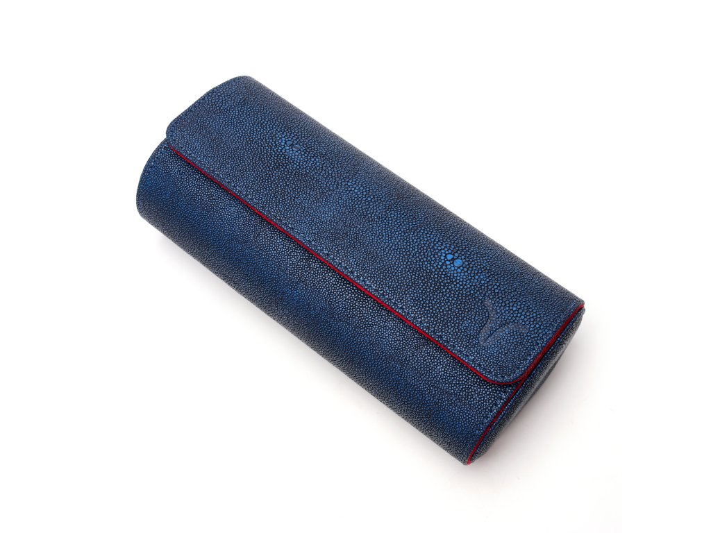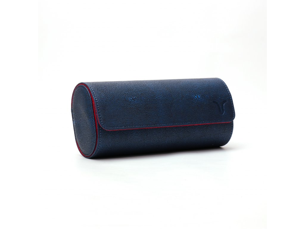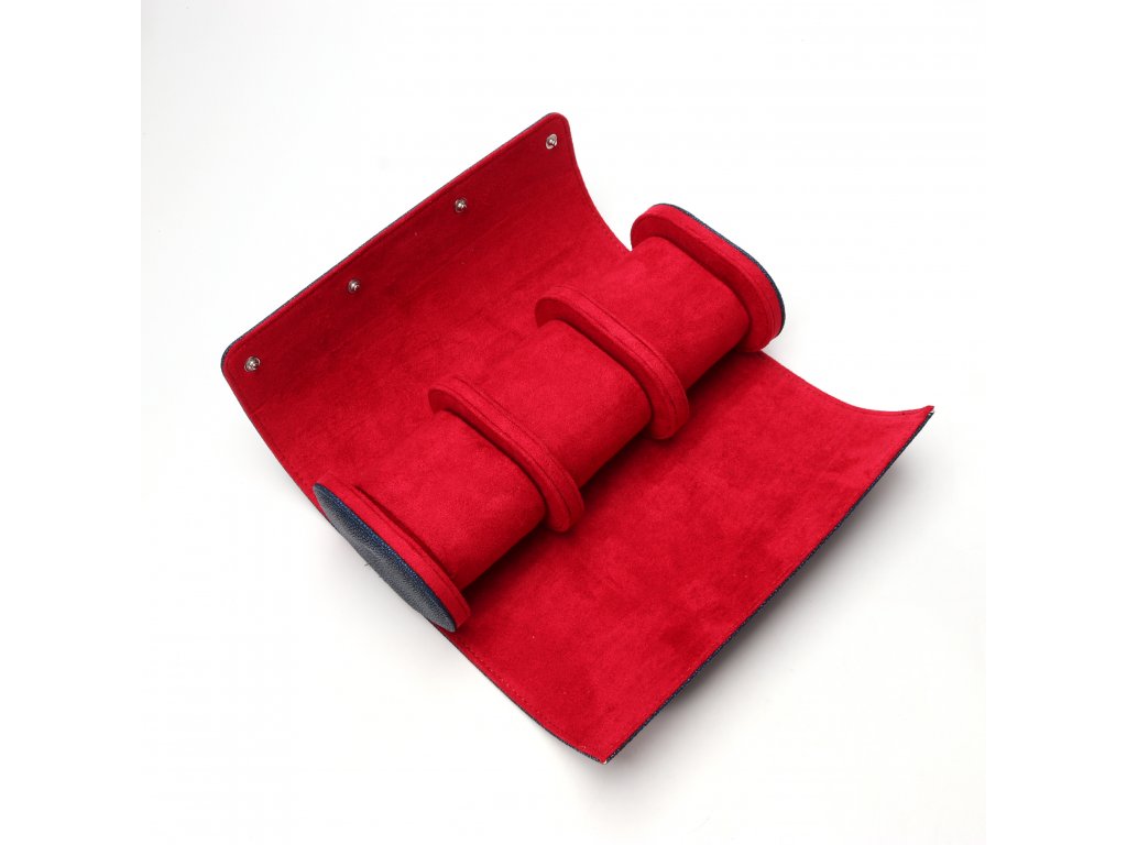 Watch Roll hodinkové pouzdro z modré kůže s interiérem z pravého semiše červené barvy. Navržen k uložení a ochraně tří kusů hodinek.