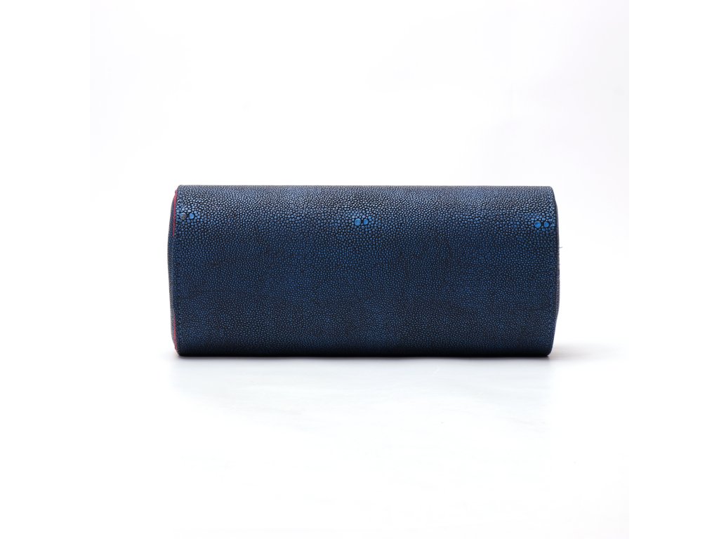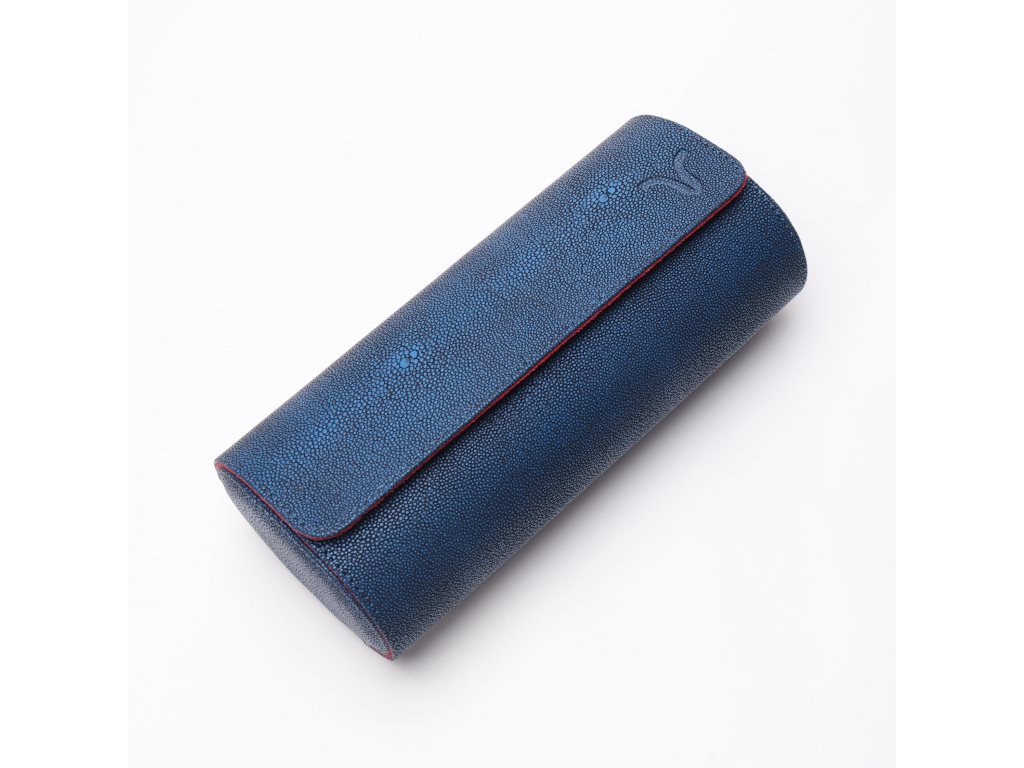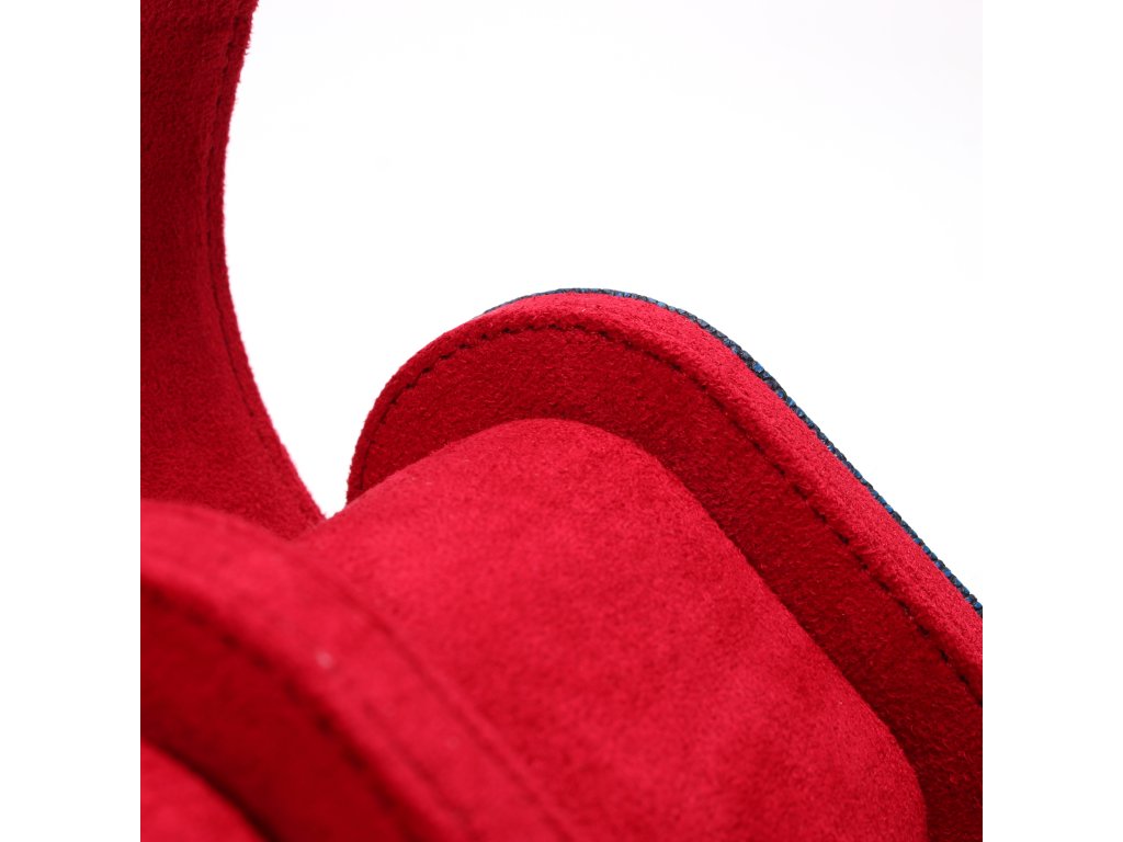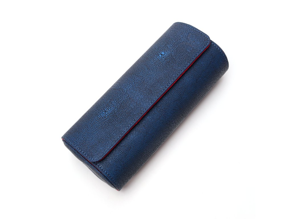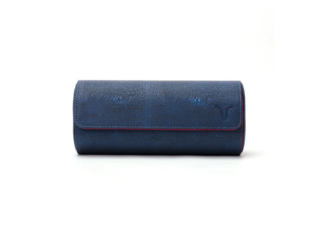 Watch Roll hodinkové pouzdro z modré kůže s interiérem z pravého semiše červené barvy. Navržen k uložení a ochraně tří kusů hodinek.